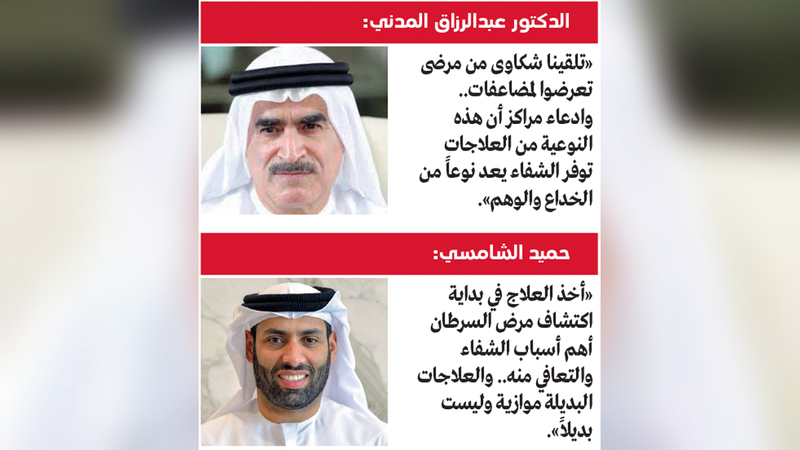من جهته، حذّر استشاري علاج الأورام، نائب رئيس جمعية الإمارات للأورام، الدكتور فلاح الخطيب، مرضى السرطان والأمراض العضوية المستعصية من اللجوء إلى أي علاج غير علمي مثبت أثره في الشفاء، مشيراً إلى أنه على مدار 36 عاماً من العمل طبيباً للأورام استقبل عشرات الحالات، التي ذهبت إلى الطب البديل والعلاج بالرقية، وإلى أشخاص ومراكز ادعوا قدرتهم على علاجهم، إلا أنهم عند عودتهم إلى العلاج العلمي يكون حلم الشفاء قد ذهب، وأصبح من الصعب أن يعود المريض إلى حالته الصحية السليمة، ومنهم من أدت بهم هذه الممارسات وتأخره في الحصول على العلاج المناسب إلى الوفاة.