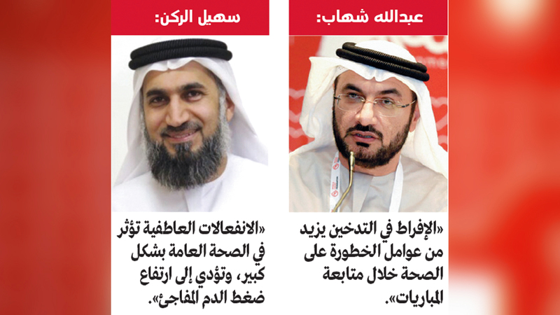 وأكد أن من أكثر العوامل التي تزيد من عوامل الخطورة أيضاً خلال متابعة المباريات، الإفراط في التدخين بشكل زائد على الحد، حيث يفقد معظم المدخنين قدرتهم على السيطرة على معدلهم الطبيعي دون أن يشعروا، ما يرفع معدلات الإصابة بأمراض الشرايين، وقد يرفع أيضاً معدلات الإصابة بالجلطات، محذراً من تجاهل ضبط هذه الممارسات التي تمس بشكل أساسي حياة وصحة الإنسان.