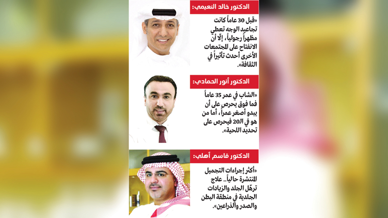 وقال استشاري الأمراض الجلدية، الأستاذ في جامعة محمد بن راشد للطب والعلوم الصحية، الدكتور أنور الحمادي، إن عمليات التجميل للرجال تختلف حسب الفئات العمرية، إذ «يحرص الشاب في عمر 35 عاماً فما فوق على أن يبدو أصغر عمراً، فيما يحرص الشباب في عمر 20 عاماً على تحديد اللحية».