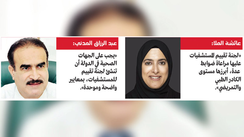 بدورها، قالت عضو المجلس الوطني الاتحادي عائشة محمد الملا، إن لجنة تقييم المستشفيات يجب أن تراعي ضوابط عدة عند تقييمها، أبرزها مستوى الكادر الطبي والتمريضي، من حيث الشهادات العلمية والمهنية الحاصلين عليها، حيث لا تتساوى الخدمة بينها وبين أخرى يديرها كادر أقل من الناحيتين.