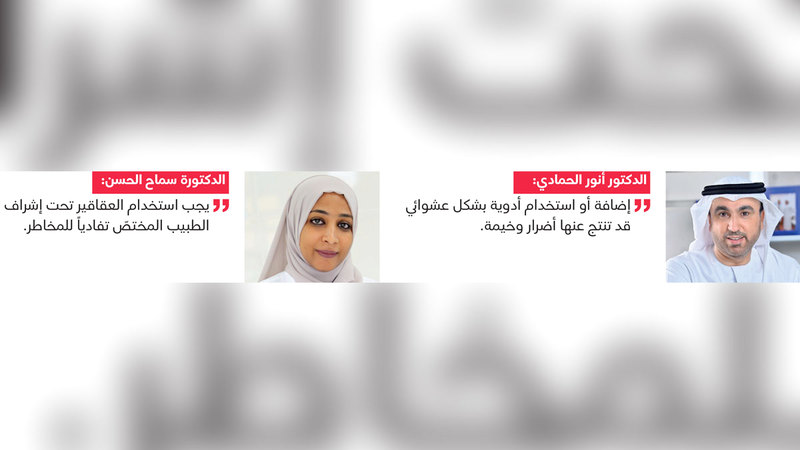 وشددت الدكتورة سماح على ضرورة استخدام هذه العقاقير تحت إشراف الطبيب المختص، والابتعاد عن الاستخدام العشوائي لها، خصوصاً أن هذه المواد تمتص وتدخل إلى الدم، وقد تسبب مخاطر كثيرة للمستخدمين، خصوصاً من يعانون أمراضاً مختلفة، ويتناولون أدوية قد تتعارض مع مكونات المواد المخلوطة.