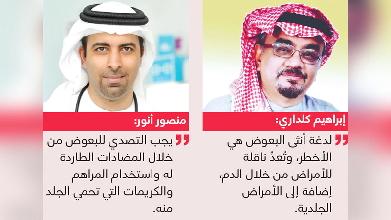 وقال استشاري وأستاذ الأمراض الجلدية في كلية الطب في جامعة الإمارات، الدكتور إبراهيم كلداري: إن عيادات الأمراض الجلدية شهدت خلال الفترة الأخيرة مرضى يعانون مشكلات بسبب البعوض، مشيراً إلى أن لدغة أنثى البعوض هي الأخطر، وتُعدُّ ناقلة للأمراض من خلال الدم، أبرزها الملاريا وحمى الضنك، إضافة إلى الأمراض الجلدية، مثل الحساسية وظهور بقع وحبيبات على الجلد تستدعي التدخل الطبي.