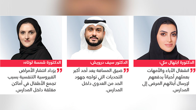 وشددت على ضرورة عدم إرسال الأبناء إلى المدارس خلال فترة المرض، وعزلهم في المنزل، حتى يتعافوا، لحماية زملائهم الطلبة من الإصابة، والتأثير في تحصيلهم الدراسي، ودعت إلى تعزيز الجانب التوعوي لدى الكوادر التعليمية في المدارس، لضمان إلزام الطلبة بسلوكيات صحية خلال وجودهم داخل الصفوف.