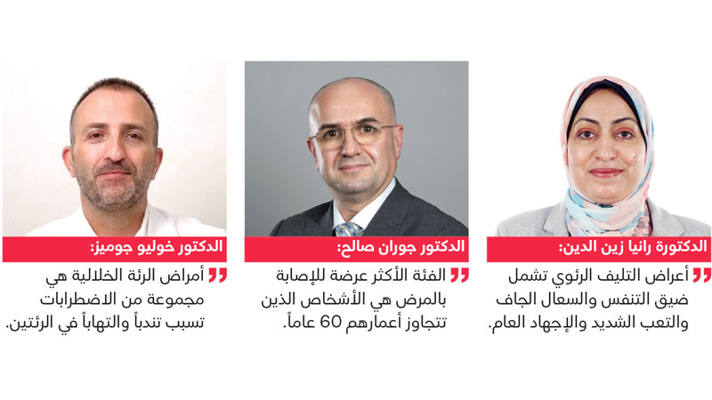 وقالت أخصائية الجهاز التنفسي، الدكتورة رانيا زين الدين: إن التليف الرئوي هو تندب وتيبس للأنسجة المحيطة بالحويصلات الهوائية وما بينهما، موضحة أن «هذا النسيج الصلب يمنع الرئة من أداء وظائفها الحيوية، فتقل مستويات الأكسجين الذي يصل إلى الدم، ما يؤثر سلباً في القلب، ويؤدي إلى ارتفاع ضغط الشريان الرئوي وضعف الجانب الأيمن من عضلة القلب».