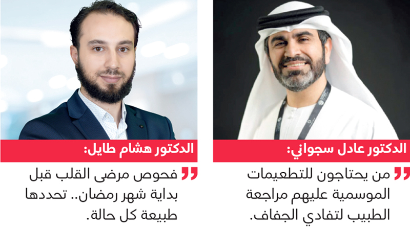 وأضاف أن من يحتاجون إلى التطعيمات الموسمية للحماية من بعض الأمراض الفيروسية عليهم أيضاً مراجعة الطبيب لتفادي أي جفاف قد يحدث خلال نهار رمضان بسبب قلة السوائل في الجسم، مؤكداً ضرورة مراجعة الأشخاص الذين يتناولون حقن تخسيس أسبوعية لحالتهم الصحية، حيث قد تؤدي إلى انخفاض مستوى السكر في الدم عند بعض الأفراد، ما يتطلب تعديل مواعيد الحقن ونوعية الطعام.