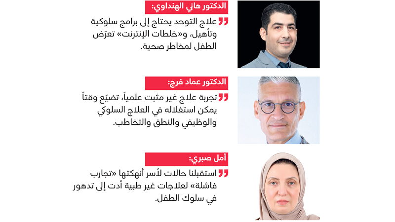 وقالت مديرة مركز الإمارات للتوحد، أمل جلال صبري، إن «الأهل مستعدون لتجربة أي شيء قد يعطيهم بصيصاً من الأمل، خصوصاً حين يشعرون بأن التحسن بطيء أو غير ملموس، فتُستغل مشاعرهم جهات غير مسؤولة تقدم وعوداً زائفة»، مشيرة إلى أن «هذه العلاجات الوهمية لها أضرار شتى، منها خطر صحي مباشر، حيث تكون بعض المواد غير مرخصة أو غير مناسبة للأطفال ذوي التوحد، وقد تسبب آثاراً جانبية خطرة عليهم».