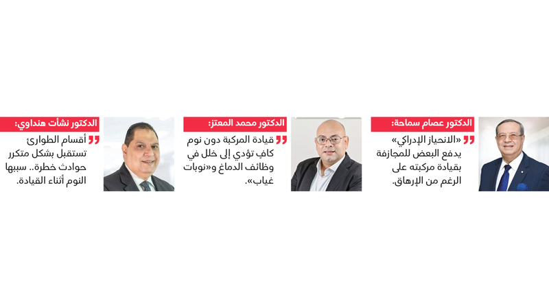 وحذر رئيس قسم طوارئ، الدكتور نشأت هنداوي، من خطورة القيادة تحت تأثير الإرهاق وقلة النوم، مؤكداً أن الطوارئ تستقبل باستمرار حالات ناتجة عن نوم السائق أثناء القيادة أو تأخره في الاستجابة بسبب التعب الشديد.