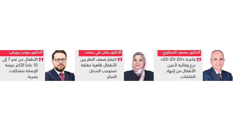 وشدد أخصائي طب وجراحة العيون، الدكتور محمود حامد السنباوي، على أهمية دور الأسرة في حماية نظر الأطفال من الآثار السلبية للاستخدام المفرط للأجهزة الذكية، داعياً إلى تقنين أوقات استخدام الشاشات بحسب عمر الطفل، وتشجيع فترات الراحة المنتظمة والأنشطة البدنية اليومية، خصوصاً اللعب في الهواء الطلق، الذي أظهرت الدراسات قدرته على الحد من تطور قصر النظر، وضرورة التأكد من الجلوس السليم للطفل، وترك مسافة كافية بينه وبين الشاشة، والاهتمام بترطيب العينين، لاسيما في البيئات الجافة أو المُكيفة.