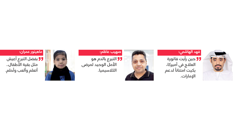 أما والدة الطفل حمدان عبدالله (سبعة أعوام)، فقالت إنها لاحظت الأعراض التي ظهرت على طفلها منذ كان عمره أربعة أشهر، من اصفرار بشرته وتعبه الشديد. وبعد الفحوص تبيّن أنه مصاب بالثلاسيميا، مضيفة: «منذ ذلك الوقت، ونحن نعتمد على التبرع بالدم، وكل كيس دم يصل إليه هو بمثابة حياة جديدة له، شكري لكل متبرع لا يوصف، فأنتم من تمنحون ابني فرصة ليعيش حياة جديدة».