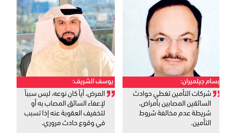 وأكد الشريف أن «العبرة تكمن في العلم بالمرض، فقد لا يكون قائد المركبة على علم بمرضه، لعدم متابعته الفحوص الطبية دورياً، مثل مرض السكري غير المنتظم وأمراض القلب، ففي هذه الحالات تنعقد مسؤوليته عن الحادث، أما إذا كان يعلم بمرضه، فإن مسؤوليته هنا تكون مسؤولية مشددة، لأنها تمثّل تهوراً وإهمالاً جسيماً يصل إلى حد القصد والعمد والاستهانة بالقيادة وآثارها في ظل مرضه المؤثر في حالته ووعيه وقدرته على القيادة والسيطرة على مجريات الأمور ومفاجآت الطريق».