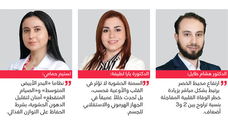 وشددوا على أن سمنة البطن تُشكّل تهديداً صامتاً، إذ قد لا تظهر أعراضها في المراحل المبكرة، مؤكدين أهمية الفحص الدوري وقياس محيط الخصر، وعدم الاعتماد فقط على مؤشر كتلة الجسم، لتقييم المخاطر الصحية، داعين إلى أهمية الوقاية عبر الرياضة المنتظمة، وممارسة تمارين المقاومة، واتباع نظام غذائي متوازن منخفض السكريات والدهون المصنعة.