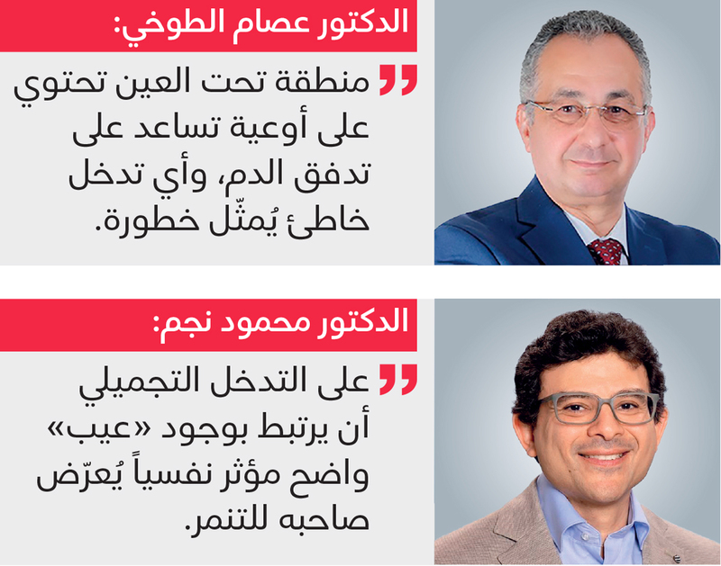 وحذّر استشاري طب وجراحة العيون، الدكتور عصام الطوخي، من أن «أي خطأ في حقن منطقة ما حول العين، قد يؤثر مباشرة في الجفون وعضلات العين، وتالياً الرؤية، لأن هذه المنطقة تُعدّ من أكثر المناطق حساسية في الوجه».