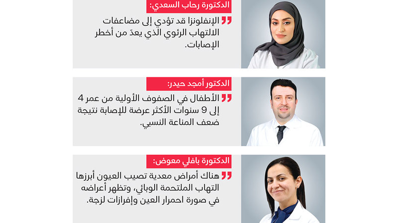 وحذرت من خطورة الأمراض التنفسية المعدية، إذ إن الإنفلونزا قد تؤدي إلى مضاعفات مثل التهاب الشعب الهوائية أو الالتهاب الرئوي، الذي يعد من أخطر الإصابات، وقد يتطلب دخول المستشفى، خصوصاً لدى الأطفال ذوي المناعة الضعيفة، كما أن سرعة الانتشار تؤدي إلى غياب عدد كبير من الطلاب عن الدراسة، وإمكانية انتقال العدوى إلى الأسرة والمجتمع.