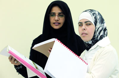 ناعمة المنصوري (يسار) تساعد كفيفة على القراءة. تصوير: جوزيف كابيلان