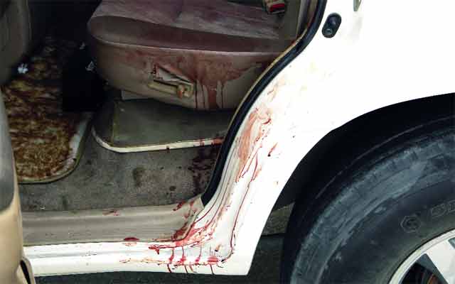 آثار الدماء على المقعد الخلفي للسيارة التي أقلّت علي محمد حسين إلى المستشفى. الإمارات اليوم