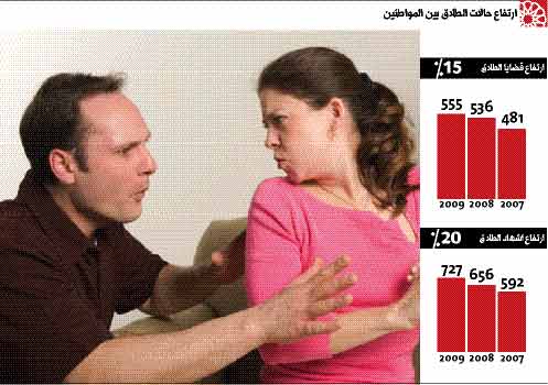 وأشار إلى أن «طلبات إشهاد الطلاق باتفاق طرفي العلاقة، شهدت ارتفاعاً بنسبة 20٪ من إجمالي إشهادات الطلاق البالغة 727 حالة في العام الماضي، وفي 2008 بلغ عدد الطلبات 656 حالة، أما في 2007 فبلغ عدد حالات إشهاد الطلاق 592 حالة».