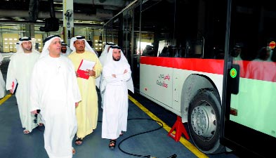 واستهل الطاير الجولة بتفقد محطة إيواء الحافلات في منطقة الروية، التي تشمل ساحة لصف الحافلات تستوعب 295 حافلة، منها 144 حافلة قياسية و151 حافلة مفصلية، كما تتضمن ورشة لأعمال الصيانة الكهربائية والميكانيكية، تستوعب 20 حافلة في الوقت نفسه، إلى جانب خدمة التموين لـ12 حافلة وموقع غسل وتنظيف يستوعب 20 حافلة في وقت واحد، ومبنى إداري يتسع لقرابة 40 موظفاً.