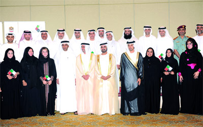 محمد بن راشد وسيف ومنصور بن زايد يتوسطون الخريجين. وام