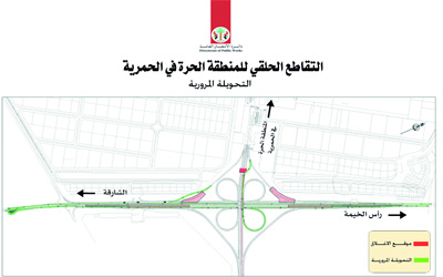 واستكمالاً للأعمال الإنشائية بالتقاطع الحلقي للمنطقة الحرة بالحمرية ستتم إزالة التحويلة القائمة على طريق عجمان ـ رأس الخيمة عند منطقة الجسر الجديد الجاري تنفيذه حالياً والمقابل لمدخل المنطقة الحرة.