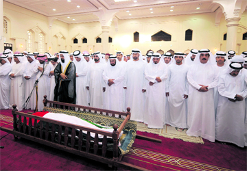 إلى ذلك أدى صاحب السموّ الشيخ محمد بن راشد آل مكتوم نائب رئيس الدولة رئيس مجلس الوزراء حاكم دبي، وأصحاب السموّ أعضاء المجلس الأعلى حكام الإمارات، عصر أمس، صلاة الجنازة على المغفور له الشيخ صقر بن محمد القاسمي الذي انتقل إلى جوار ربه صباح أمس، وذلك في مصلّى العيد في منطقة خزام في رأس الخيمة.