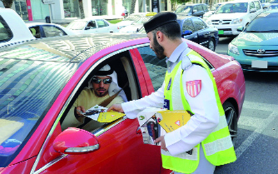 الشرطة توزّع منشورات توعية على قائدي المركبات. من المصدر