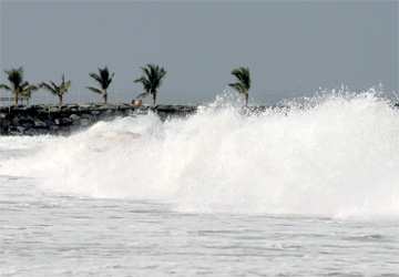 والبحر مضطرباً يصبح متوسط الموج في المساء والليل، ويراوح ارتفاع الموج من قدمين الى أربع أقدام قرب الساحل، ومن اربع الى ست اقدام بالعمق، ينخفض الى ثلاث الى خمس اقدام في المساء والليل.
