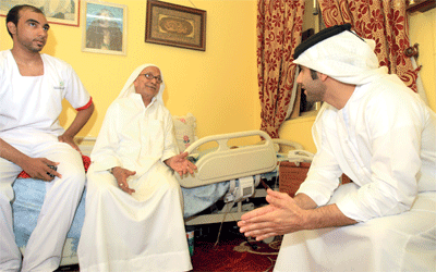 منصور بن محمد خلال زيارته المواطن سالم وبجانبه متطوع لرعايته. تصوير: باتريك كاستيلو