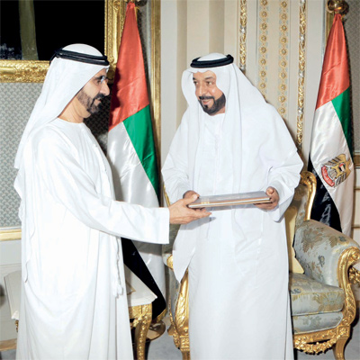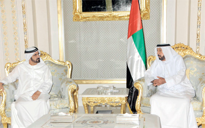 تسلم صاحب السمو الشيخ خليفة بن زايد آل نهيان، رئيس الدولة، بقصر الروضة في مدينة العين، مساء أمس، من أخيه صاحب السمو الشيخ محمد بن راشد آل مكتوم، نائب رئيس الدولة رئيس مجلس الوزراء حاكم دبي، جائزة شخصية العام الإسلامية، التي تنظمها جائزة دبي الدولية للقرآن الكريم في دورتها الخامسة عشرة هذا العام، وذلك بحضور سمو الشيخ مكتوم بن محمد بن راشد آل مكتوم، نائب حاكم دبي، وسمو الشيخ حمدان بن زايد آل نهيان، ممثل الحاكم في المنطقة الغربية.