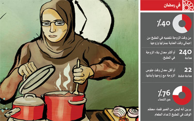 ووفقاً لرئيس المجلس المستشار الأسري خليفة المحرزي، فإن «معدل بقاء الزوجة في المطبخ طوال شهر رمضان يتجاوز 240 ساعة طبخ، في حين أن عدد ساعات النوم يصل في المتوسط إلى 180 ساعة تقريباً، من إجمالي عدد ساعات الشهر نفسه البالغ 720 ساعة، فيما لا تزيد مدة جلسات الزوجة مع زوجها وأبنائها طوال الشهر على 22 ساعة فقط، لاسيما أن الزوجة تقضي 90 ساعة خلال الشهر نفسه في مشاهدة البرامج والمسلسلات التلفزيونية، بمعدل ثلاث ساعات خلال اليوم الواحد».
