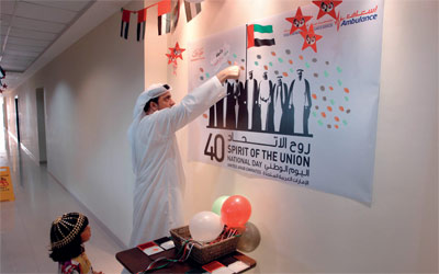 شهد المقر الرئيس لمؤسسة دبي لخدمات الإسعاف، أمس، في منطقة ورسان في دبي تدشين شعار ومجسم «روح الاتحاد» الذي يضم حكام وقادة الإمارات السبع، في الممر المعد لذلك الاحتفال، وضع جميع موظفي المؤسسة يتقدمهم المدير التنفيذي خليفة بن دراي، بصماتهم على مجسم روح الاتحاد، لتصبح وثيقة بصمة روح الاتحاد تعبيراً عن تفانيهم وحبهم لوطنهم، وتجديداً لبيعتهم للقادة والحكام، وإظهاراً لوحدتهم وقدرتهم على العيش معا بسلام ووئام على مر الزمن في هذه اللحظات التاريخية من احتفالات اليوم الوطني.