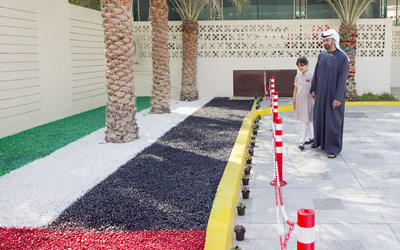 وقد توجّه سموّه مباشرة لدى وصوله مبنى المدرسة إلى الفصل الدراسي للطالبة اليازية، حيث شكل وصول سموّه مفاجأة سارة للطالبة اليازية، التي عبّرت عن فرحتها الغامرة، وشاركها زملاؤها وأسرة المدرسة الفرحة بوجود سموّه بينهم، مرحبين به، ومعربين عن سعادتهم الغامرة باهتمام سموّه وتفاعله مع مبادرة اليازية بتصميم علم الدولة، وعدد من اللوحات التي تعكس روح المناسبة الوطنية في مدرسة المنى.