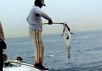 صياد ينتشل سمكة «صداه» نافقة من بحر دبي غربي «بوية زهراء». الإمارات اليوم