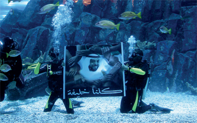 قدم المواطنان غانم صالح المرزوقي، ومحمد علي المرزوقي، عرضاً في الغوص التعبيري في «أكواريوم» دبي مول، أول من أمس، حاملين لافتة بشعار «كلنا خليفة»، تعبيراً عن حب الشعب الإماراتي والمقيمين لصاحب السمو الشيخ خليفة بن زايد آل نهيان، رئيس الدولة.