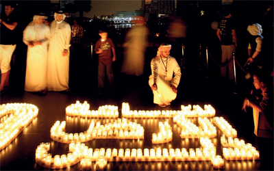 حلّ الظلام في عدد كبير من شوارع الإمارات ومنشآتها الحكومية والخاصة لمدة ساعة، الليلة قبل الماضية، مشاركة منها في «ساعة الأرض». وأطفأت معالم الإمارات أضواءها، وشهدت الشوارع مسيرات بالشموع، تضامناً مع 135 دولة حول العالم لتقليص حجم انبعاث الغازات المسببة لظاهرة الاحتباس الحراري.