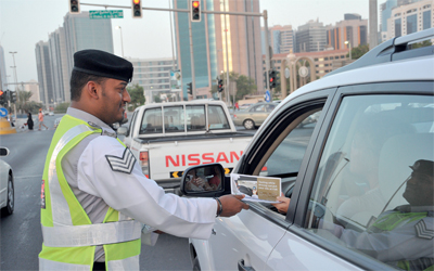شرطة أبوظبي توزع بروشورات توعية على السائقين. من المصدر