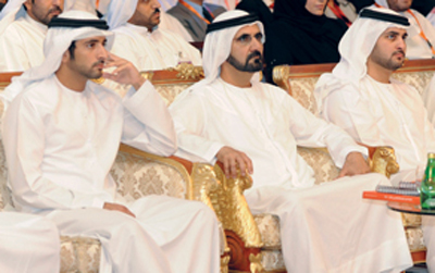 محمد بن راشد مفتتحاً منتدى الإعلام العربي بحضور حمدان ومكتوم بن محمد. وام