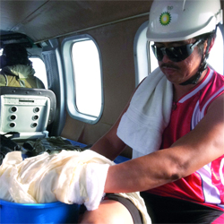 وبين الشهياري انه وبالتعاون مع إدارة السرب الثاني لحرس السواحل، وفريق غرفة العمليات بشرطة رأس الخيمة، تم تحديد مكان الباخرة، وتمكنا من خلال عملية مدروسة لم تستغرق سوى بعض الدقائق، من إنقاذ العامل من جنسية دولة آسيوية، وتقديم الإسعافات الأولية له، لحين تأمين وصوله إلى أقرب مستشفى. وأضاف ان الإنقاذ تطلّب جهداً كبيراً من الطاقم، وتوازناً في تثبيت الطائرة، لصعوبة الإنزال على متن الباخرة التي كانت في حالة عدم توقف، وتحرّك الباخرة فوق الماء.