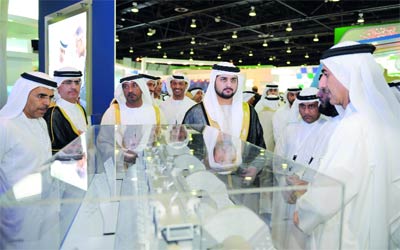 مكتوم بن محمد متجولاً في المعرض بحضور أحمد بن سعيد. وام