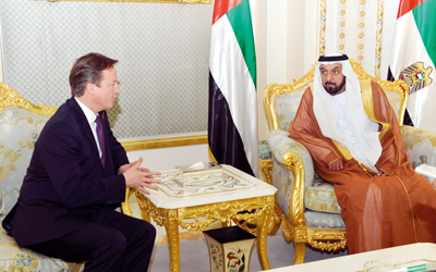 استقبل صاحب السمو الشيخ خليفة بن زايد آل نهيان، رئيس الدولة، في قصر الروضة في مدينة العين، أمس، رئيس وزراء بريطانيا ديفيد كاميرون، الذي يزور البلاد حالياً في إطار جولة له في عدد من دول المنطقة...