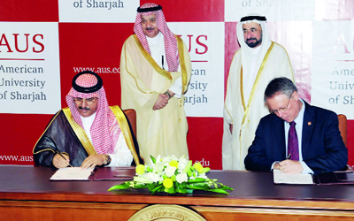 شهد صاحب السمو الشيخ الدكتور سلطان بن محمد القاسمي، عضو المجلس الأعلى حاكم الشارقة رئيس الجامعة الأميركية في الشارقة، أمس، التوقيع على مذكرة تفاهم للاستثمار التجاري لمشروع اختراع علمي من قبل أساتذة في كلية الهندسة بالجامعة، بشأن تدوير مخلفات النخيل وتحويلها إلى وقود صلب، مع رئيس مجلس إدارة مجموعة شركات لؤلؤة جبيل السعودية، الأمير نواف بن عبدالله بن سعود بن عبدالعزيز.