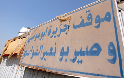 لوحة على ميناء الشارقة تشير إلى مرفأ السفن التي كانت تتوجه إلى جزيرة أبوموسى المحتلة. تصوير: مصطفى قاسمي