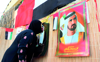 وتابعت «أحاول ان أعبر عن فرحتي ومشاركتي باليوم الوطني من خلال استحضار وصناعة تلك الأشياء القديمة التي مازالت محفورة في الذاكرة من أيام الجدود، لأقدمها هدية لحكامنا وشيوخنا في يوم الاتحاد الذي جمع شمل أبناء البلاد ووحدهم في دولة واحدة حققت مكانة وسمعة طيبة على المستويين العربي والعالمي». وأضافت: «هي هدية ومشاركة تراثية مختلفة عما هو سائد لدى كثيرين، وفكرت ونفذت البناء التراثي بكل ما فيه من ألعاب وأدوات تراثية وملابس وأسرّة للنوم، إنه نموذج للفرح، وأنا أعمل كنت افكر في كل ما كان عندنا أيام الطفولة، وأحاول ان أسترجعه وأصنعه من جديد كي يكون حاضراً في هذا البيت التراثي، فهنا المجلس، وهنا المطبخ بكل أدواته، وهنا غرف النوم، وهنا غرفة العروس وما بها من أدوات تجميل تراثية وملابس وزينة متنوعة، وهنا غرف الأطفال وألعابهم، وكل هذه الغرف والمواقع زينتها بعلم الدولة وصور الحكام والشيوخ الذين صنعوا لنا الاتحاد وبنوا دولة الوحدة».