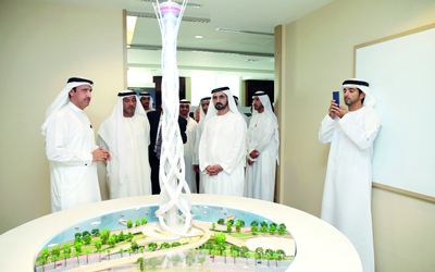 محمد بن راشد يستمع لشرح حول تفاصيل مشروع القناة الملاحية المعلّقة. وام