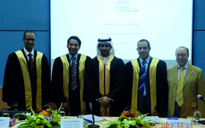 وتكونت لجنة المناقشة من الاستاذ المساعد في كلية القانون في جامعة الشارقة الدكتور أحمد فاروق زاهر، مشرفاً ورئيساً، و الاستاذ المساعد في كلية القانون في جامعة الشارقة، الدكتور جهاد محمد عبدالعزيز، مناقشاً داخلياً، والاستاذ المشارك في كلية الشرطة في أبوظبي، الدكتور رفعت محمد رشوان، مناقشاً خارجياً. يشار إلى ان الباحث حاصل على درجة البكالوريوس في العلوم الشرطية بدرجة امتياز مع مرتبة الشرف، وحاصل على بكالوريوس في القانون من أكاديمية دبي بجانب حصوله على دبلوم المحاماة من معهد التدريب والدراسات القضائية.