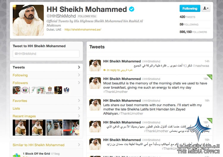 وأصبح صاحب السمو الشيخ محمد بن راشد آل مكتوم من خلال صفحته على موقع تويتر صانعا عالميا للأخبار، حيث يعد سموه من المغردين الذين لا يكتفون بإعادة التغريد وتبادل الأخبار، بل هو مصدر موثوق عالميا للأخبار، وهو ما يعرف بالمغرد في مصطلحات "تويتر".