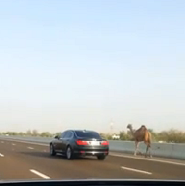 تسببت مجموعة من الجمال السائبة، على طريق العين- أبوظبي، بعرقلة سير السائقين، بعد أن كانت تتسابق معهم على الطريق.