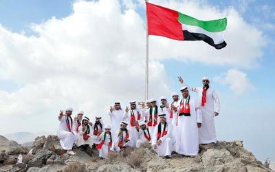 احتفى مواطنون، أمس، بيوم العَلَم من خلال تدشين سارية ورفع علم الدولة عليها، وذلك على قمة جبل «جيس» الأعلى في الدولة، بارتفاع 1900 متر عن مستوى سطح البحر، ونظم الحدث منتدى الرمس وتكاتف، بالتعاون مع مركز أجواء، ومنتزه رأس الخيمة للحياة البرية، ودائرة الأشغال والخدمات العامة في رأس الخيمة، وفرقة جمعية دبي الحربية.