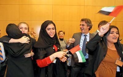 فرحة الوفد الإماراتي في باريس لحظة الإعلان عن فوز دبي. أ٫ب