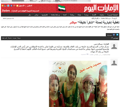 يمكن للقراء إرسال مشاركاتهم بصورة.. أو عبارة.. أو فيديو قصير.. أو تحية من القلب لرئيس الدولة إلى البريد الإلكتروني للخدمة التفاعلية 1971ey@gmail.com كي يتم نشرها بشكل مباشر على صفحة التغطية المباشرة لحملة "شكراً خليفة"