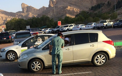شرطة العين توزع كتيبات توعية على السائقين في متنزه مبزرة. من المصدر